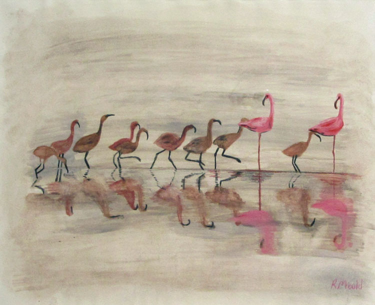 Description: This piece captures the hustle and bustle of flamingo life. The adults stand composed in that iconic pose – on one leg. The younger chicks stride across the water, bumping and jostling. They seemingly ‘walk on water’ and everything is reflected in the water like a giant mirror.