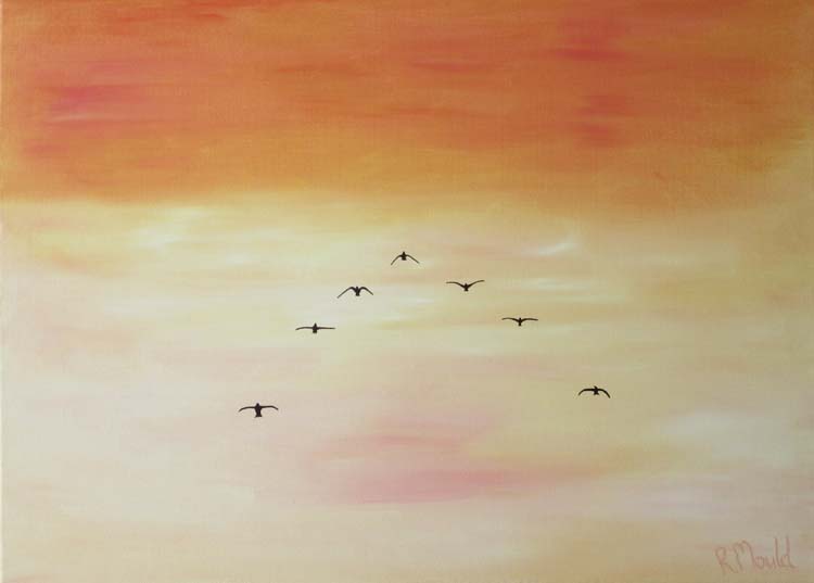 Description: Fly with a a line of birds in the V formation through a sunset sky.